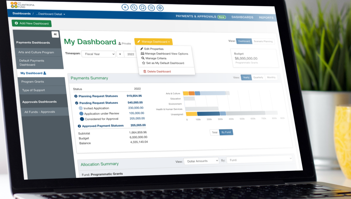 - Dashboard personalization – Grants managers, program staff, senior executives, and board members can now create personalized views of grants data based on unique criteria. The feature supports multiple payments and approvals dashboards, which can be kept private or shared with others across the foundation.